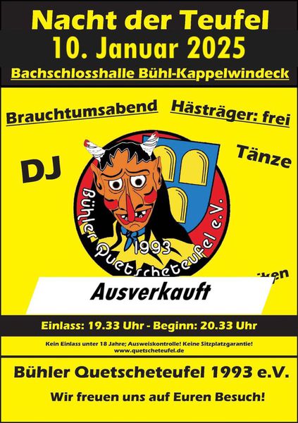 Am Freitag des zweiten Wochenendes unserer Kungelhexen Tour 2025 waren wir, leider nur mit einer kleineren Abordnung, bei den Quetscheteufel aus Bühl- Kappelwindeck zu Besuch. Die Nacht der Teufel in der Bachschlosshalle ist traditionell gespickt mit Hexen- und Showtanz Auftritten. Wir hatten einen sehr kurzweiligen Abend mit einer Menge Spass und tollen Tänzen. Wir kommen nächste Kampagne gerne wieder.