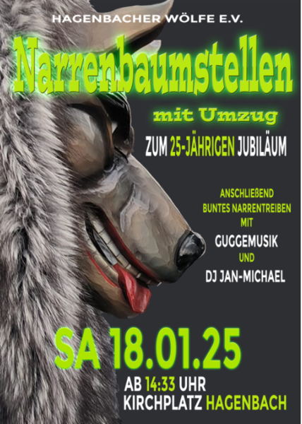 Am Samstag, 18.01.25 waren wir zu Gast beim 25 jährigem Jubiläum der Hagenbacher Wölfe. Das Wetter war einwandfrei und bescherte den Jubilaren einen tollen Umzug mit anschließendem Narrenbaumstellen, eine Menge Gratulanten und eine tolle Party bis tief in den Abend.