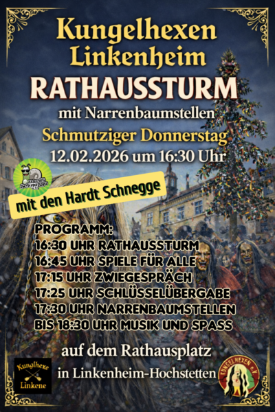 Unsere "neuer" Rathaussturm zusammen mit den Hardtschnecken fand dieses Jahr großen Anklang und... wir durften zum ersten Mal einen Narrenbaum am Rathausplatz aufstellen. Mit Unterstützung der Bauhofmitarbeiter wurde ein kleiner aber feiner Narrenbaum gestellt. Viele Besucher, aber auch einige befreundete Hexen- und Narrenzünfte waren bei uns zu Gast und wir werden diese Veranstaltung in den nächsten Jahren sicherlich erweitern.