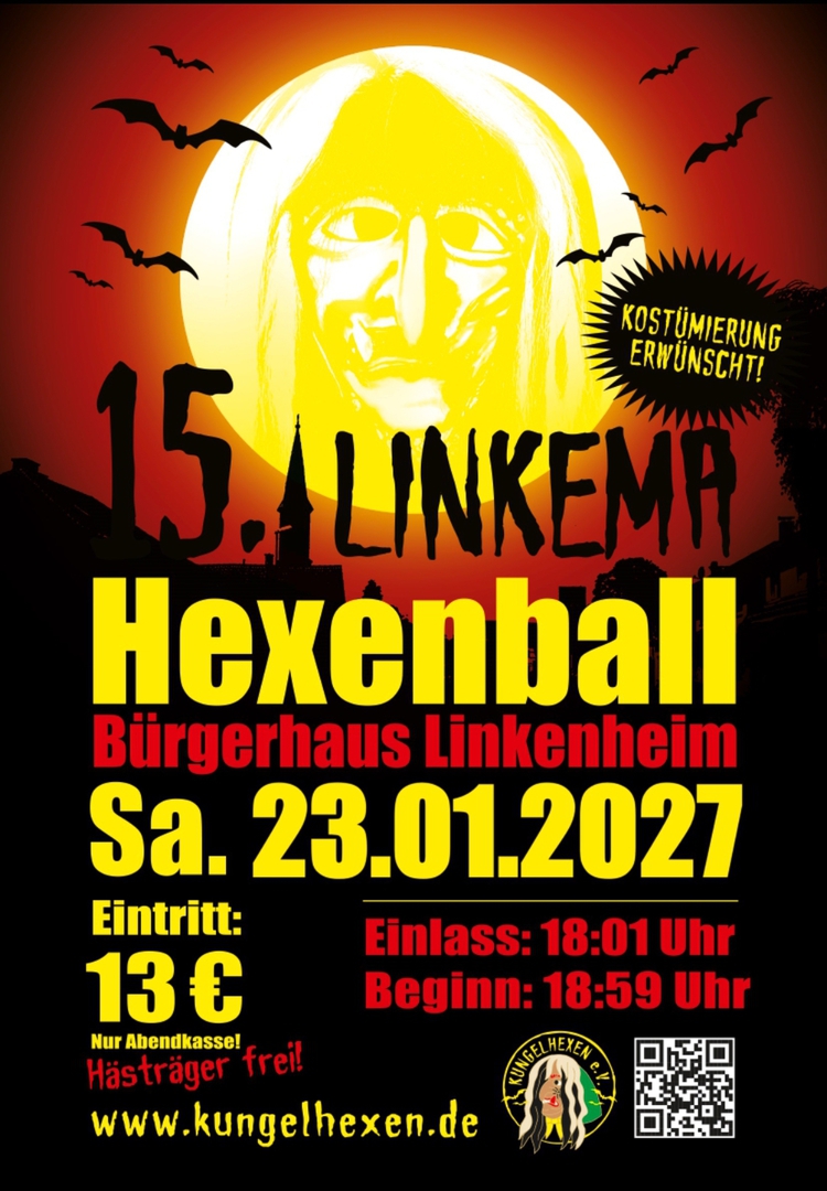 am Samstag, 23.01.2027 verwandeln wir unser Bürgerhaus in Linkenheim wieder in eine Party-Location der Superlative. Mit Guggenmusik, Brauchtums- und Showtänzen, mit Partymukke von DJ Paddy und seinem Team wollen wir mit Euch wieder einen Megatollen Hexenball feiern.